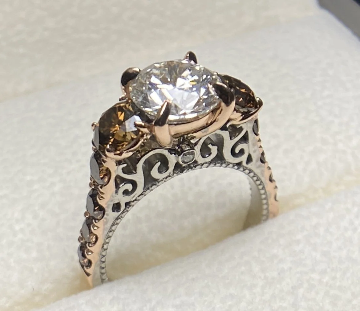 1.7ctw center Diamond w/ two side Chocolate Diamonds set in White and Rose Gold